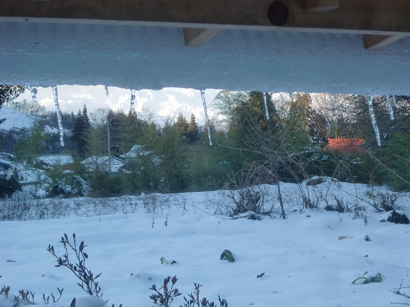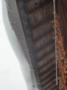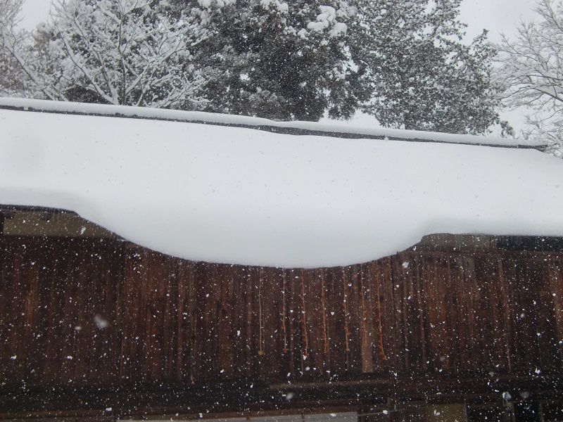 母屋の屋根から、今にも雪が落ちて来そうです。