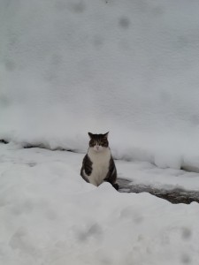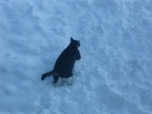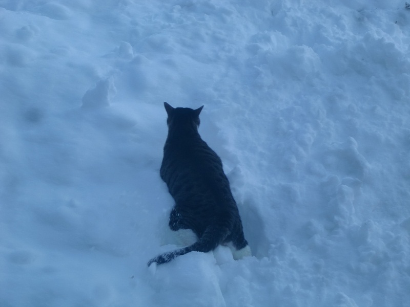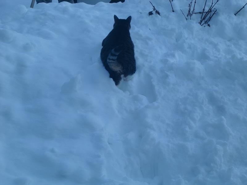 薪置き場の横では、チビ太が雪の斜面を駆け上がろうとしていました。。