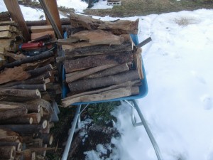 薪ストーブの火を絶やさないために、せっせと薪運びをします。