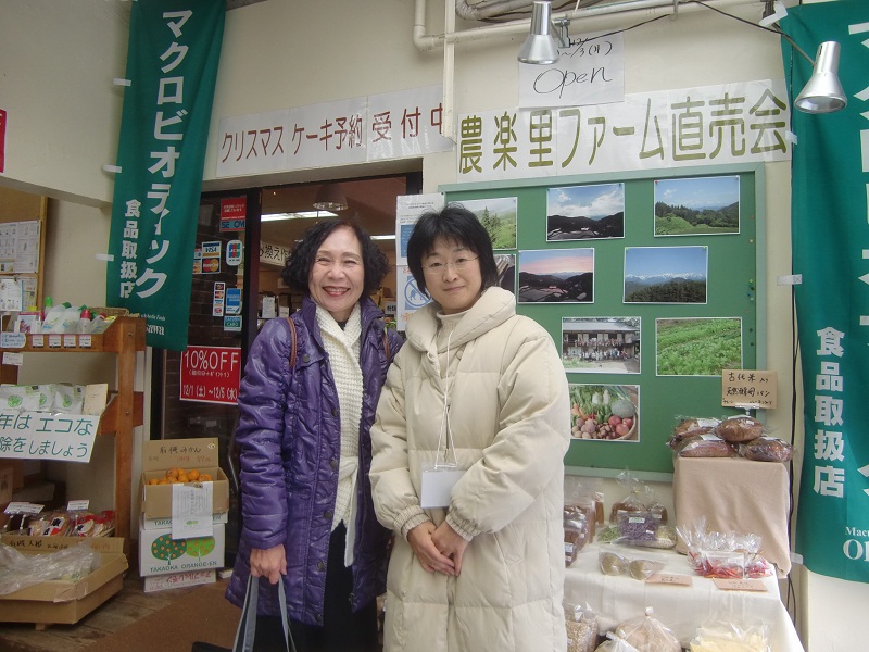 農楽里ファームの作物はすべて無肥料あるいは小肥料の自然農法であること、聖山の湧水で育てた天日干しはざ掛けのお米であること、お餅を搗くときに使うお水も湧水であること等々、、丁寧に説明をさせて頂き、試食もして頂きました。