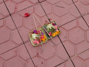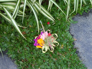 色とりどりの花びらやパンダンリーフという植物の葉が、ヤシの葉やバナナの葉で作られた器に盛られ、お線香が立てられています。