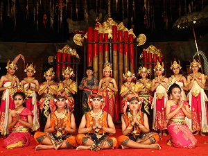 この写真は、ヴントゥヤン村のスワガサフティ楽団というジェゴク(竹でできた打楽器)の舞踊楽団です。