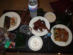 マルタバッ、アヤムバリ(地鶏の茹で卵)、魚のすり身の蒸しもの、ゴレンガン(はるさめ入り)、バナナの葉で包んだナシジンゴ、トラン・ブランというお菓子、、