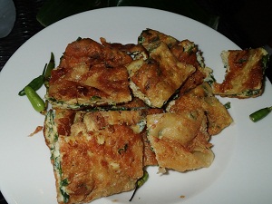 薄く伸ばしたピザ生地のようなものに、刻み長ネギ入りの玉子を入れ、油で揚げます。