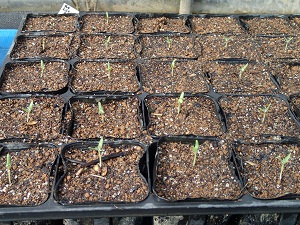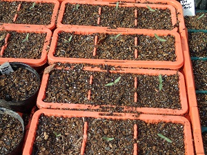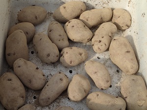 ジャガイモの種イモは、お陽様を浴びて紫色のしっかりとした芽を出し始めました。