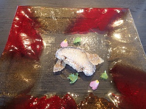 次に、生シイタケの前菜。あしらわれている花びらが可愛らしい!