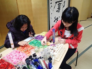 綺麗なビーズを使い、万華鏡作りに夢中になっている、久高島のまおちゃんと北大東島のとわちゃんです。