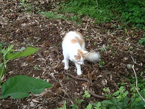 農楽母さん、「ミコ太、もうかまうのはやめなさい!」と、ミコ太を抱きあげ母屋へと強制送還。