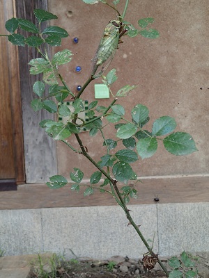 バラの小枝の下の方には、抜け殻が残っています。