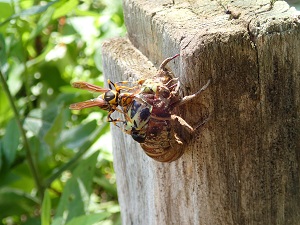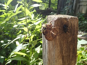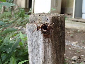 こちらは、ウッドデッキの横の杭につかまり、今まさに羽化しようとしているところ、、、