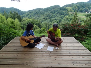 こちらは、休憩時間にウッドデッキで副園長の長谷川さんと一緒にギターの練習をする農楽母さんです!