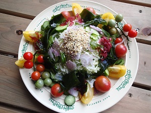 畑では、トマトも採れ始めましたので、キャベツ+キュウリ+赤タマネギ+いろいろトマト+海草のサラダ。