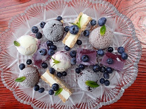 豆乳のチョコアイス、バナナとココナツミルクのチョコアイス、カシューナッツとブルーベリーのフローズンヨーグルト、塩バニラアイスのクッキーサンド、ブドウとココナツミルクの2色ゼリー。。