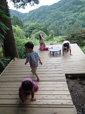 ウッドデッキにてのお食事の最中に、なぜかV字バランスを取る寺島さんです・・!