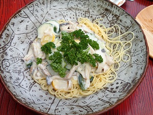 メインは、ズッキーニとエリンギの豆乳のクリームパスタと、トマトソースのパスタ、です!