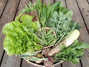 葉付き大根、玉ねぎ、赤タマネギ、サラダ菜、グリンリーフレタス、サニーレタス、水菜、小松菜、ルッコラ、グリンピース、サヤエンドウ、これに、ラディッシュとラッキョウも入ります!