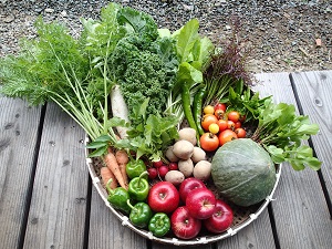 葉付き大根、葉付きニンジン、ジャガイモ、トマト、ミニトマト、カボチャ、ピーマン、万願寺とうがらし、野沢菜の間引き菜、ケール、水菜、紫水菜、ルッコラ、バジル、ラディッシュ、丸ナス、枝豆、紅玉