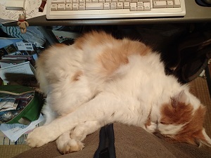 パソコンに向かう農楽母さんの膝の上、、、