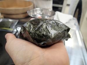 これは、農楽母さんのおむすびですが、上下の海苔が貝合わせのようにぴったりと合い、白いご飯が見えないようにくるんでいます。