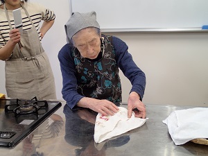 そして、ハンドタオルにおむすびを包みます。