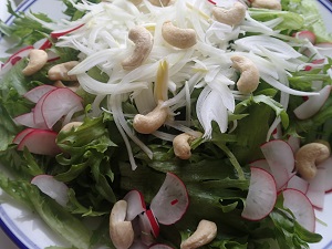 サラダを盛り合わせ、、(今、農楽母さんの野菜畑は雪の下なので、篠ノ井の地場産のお野菜です)