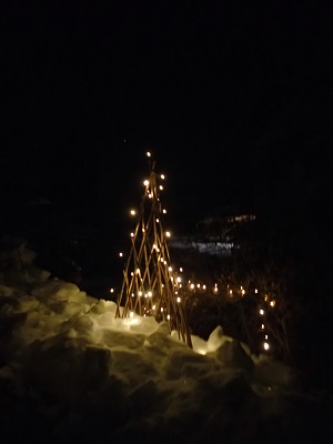 農楽里ファームの母屋の前でも、雪の上に小さなソーラーイルミネーションが灯っています!