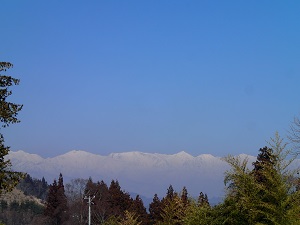 農楽里ファーム母屋の前から西の方角に望む北アルプス白馬三山、、