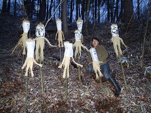 魔除け、厄除けの藁人形を作り、集落のかつての入口だったところに立てこの一年の無病息災を祈ります。