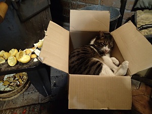 冷え込みがきついせいでしょうか、、チビ太は薪ストーブ横の段ボール箱に入ってお休みしておりました。。
