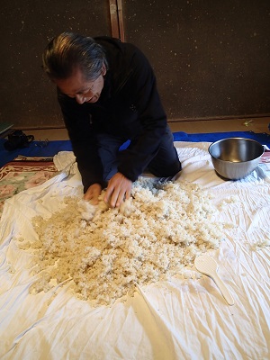 蒸し上がった米に、種麹をまぶしてもみ込むIさんです。