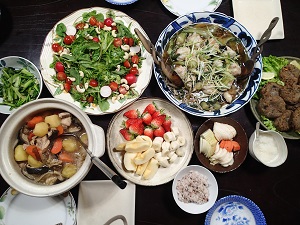 野菜サラダ、自然薯とレンコンボールのあんかけ、自家製大豆のおからのさつま揚げ、肉じゃが、カブの葉の炒め物、ぬか漬け、フルーツ盛り合わせ、、などなど。。。
