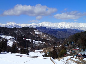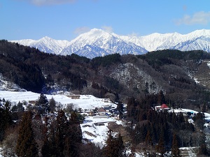 少しクローズアップしまして、、蓮華岳を背景に農楽里ファームのある慶師集落です。