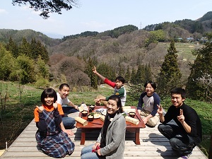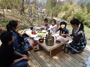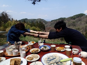 お昼の腹ごしらえは、新しく出来ましたウッドデッキを使いまして、、20人の皆さんでテーブルを囲みました!