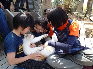 子どもたちに抱っこされるモフモフミコ太んに、、