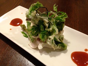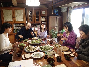 皆さんとのランチは、摘んできた野草を天ぷらにしての仁さんの手打ちそば!
