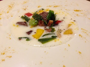 スープ(これは、菌耕栽培の長いもベース)にはカンゾウ、コゴミ、アサツキが。。