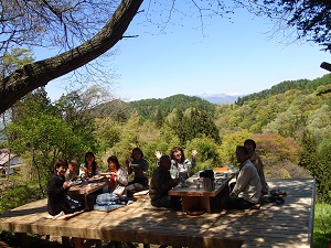お昼は、先生を囲みまして戸隠山を望むウッドデッキにて。