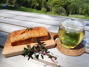 ティータイムには、高知県の「わたなべ農園」さんから届きました無農薬のショウガがたっぷり入ったジンジャーパウンドケーキとブラックペパーミントのハーブティー!