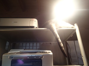 デスクトップの上にあるスキャナーの横には、ドスンとチビ太が寝ています。。