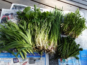 カンゾウ、葉(花)ワサビ、あさつき、セリ、コゴミ。