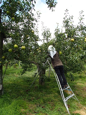 高いところの実は脚立を立てて収穫するのですが、実が重いのでリンゴの収穫よりも肩が凝ります。。