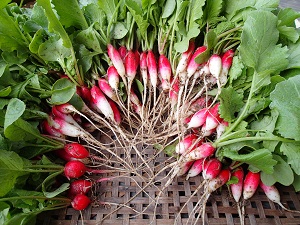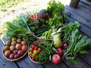 ジャガイモ、タマネギ、赤タマネギ、鮮紅大長人参、キュウリ、ピーマン、バナナピーマン、ボタンコショウ、カボチャ、白ナス、長ナス、リーフレタス、カブの間引き菜、ダイコンの間引き菜、コマツナ、インゲン、ラディッシュ、ミニトマト、バジル、青シソ、サンショウの実、それに、トクナガさんのリンゴと洋ナシのマルゲリット・マリーラ!