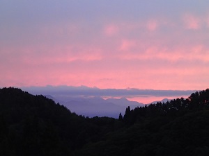 早朝5時過ぎのこと、、、2階の明り取りの窓から射す陽で居間がピンク色に染まってくるので、「わわわ~」と慌ててカメラを持ってウッドデッキに飛び出しました!