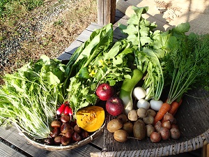小松菜、ミズナ、アスパラ菜、ルッコラ、チンゲン菜、青長ダイコン、かぶ、ラディッシュ、葉付きニンジン、枝豆、ジャガイモ、タマネギ、栗、カボチャ、りんご、キウイ、、