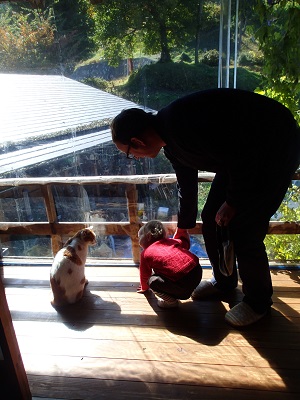 夕方、ハウス内の片づけをしていたところへ、ミコ太がやってきまして、、、