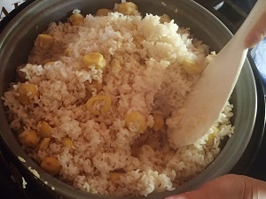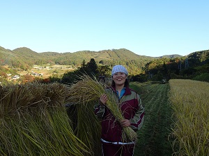 お昼ごはんには、みんなで美味しい栗ご飯と小松菜の味噌汁を頂きまして、イザ、稲刈りへ出動です!!