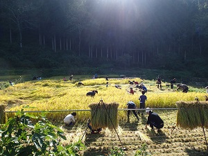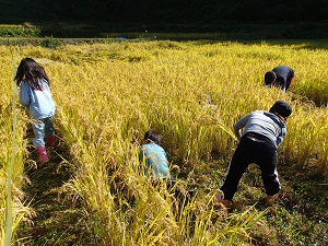 そして、今年も子どもたちと学生さんの入り混じった3チームに分かれ、速さと、丁寧さ、美しさを競いながら稲刈りを楽しみました。