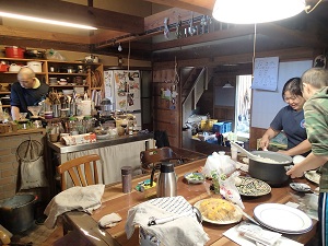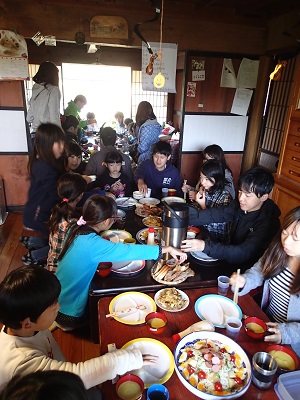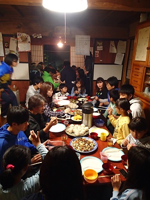 ぎゅうぎゅう詰めの居間ですが、総勢47人の大家族が、わいわいと賑やかに楽しく食卓を囲みます。