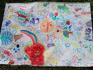 大きなキャンパス地に描かれたたくさんの生き物たちを、真ん中のお陽様が明るい笑顔で照らしています!!