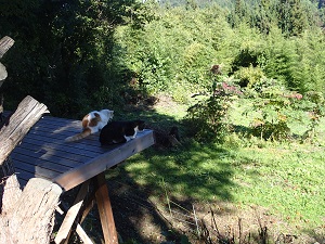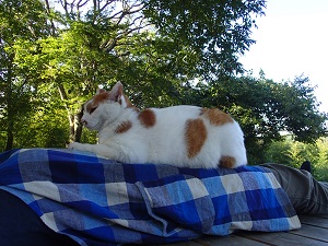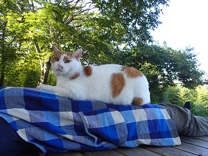 ウッドデッキに横たわったお腹の上に、チャイがどっかりと、、